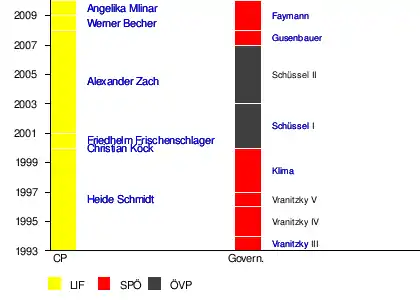 The chart below shows a timeline of the Liberal chairpersons and the Chancellors of Austria. The left bar shows all the chairpersons (Bundessprecher, abbreviated as "CP") of the Liberal party, and the right bar shows the corresponding make-up of the Austrian government at that time. The red (Social Democratic Party of Austria, SPÖ) and black (Austrian People's Party, ÖVP) colours correspond to which party led the federal government (Bundesregierung, abbreviated as "Govern."). The last names of the respective chancellors are shown, the Roman numeral stands for the cabinets.