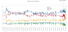 By the time Ignatieff was confirmed as party leader, the Liberal Party had a comfortable lead over the governing Conservatives.[80][81][82] Support fell over the summer as Igantieff was characterized of "missing in action", and Ignatieff announced on August 31, 2009, that the Liberals would not support the minority Conservative government when Parliament resumed.[83][84][85] A month later, on October 1, the Liberals put forth a non-confidence motion; however, the NDP abstained from voting and the Conservative government survived.[86] The attempt to force an election, just a year after the previous one, was viewed as a miscalculation, as polls showed that most Canadians did not want another election.[87] Afterwards, popularity for Ignatieff and his party continued to fall.[88] Over the next year and a half, with the exception of a brief period in early 2010, support for the Liberals remained below 30 percent, and behind the Conservatives.[89]