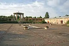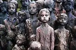 A sculpture from the 1990s by Marie Uchytilová overlooks the site of the old village of Lidice. Entitled "The Memorial to the Children Victims of the War" it comprises 82 bronze statues of children (42 girls and 40 boys) aged 1 to 16, to honour the children who were murdered at Chełmno in the summer of 1942. A cross with a crown of thorns marks the mass grave of the Lidice men. Overlooking the site is a memorial area flanked by a museum and a small exhibition hall.[33] The memorial area is linked to the new village by an avenue of linden trees. In 1955 a "Rosarium" of 29,000 rose bushes was created beside the avenue of lindens overlooking the site of the old village. In the 1990s the Rosarium was neglected but after 2001 a new Rosarium with 21,000 bushes was created.[34]