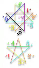 In the fight against lietuvēns the most important role is played by so-called lietuvēns’ cross (Latvian: lietuvēna krusts) that can be two types - simple and double. Simple looks like a five-pointed star (pentagram) and double or big cross looks like two pentagrams put together (in Latvia it can be also named auseklis[8]). Particularly auseklis symbolizes the morning star, the victory of light in the battle against darkness. Lietuvēns’ cross in general stands for safety, protects against ghosts and, especially, lietuvēns,[7] but auseklis is considered to be the strongest variant of the lietuvēns’ cross.[8] Such crosses can be often seen on doors, thresholds, windows and other things.[9] It can be drawn also on cows’ and horses’ hoofs, and even people, who suffer from lietuvēns, draw lietuvēns’ cross on their nails.[1]