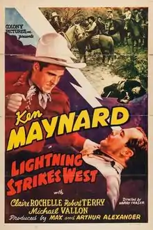 Lightning Strikes West is a 1940 American Western film directed by Harry L. Fraser and written by Martha Chapin. The film stars Ken Maynard, Claire Rochelle, Bob Terry, Michael Vallon, Charles King and Reed Howes. The film was released on June 1, 1940, by Colony Pictures.[1][2][3]