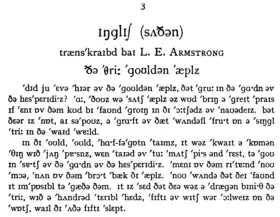 - Armstrong, L. E. (1922). "ɪŋglɪʃ (sʌðən): ðə ˊθriː ˊgoʊldən ˊæplz" [English (Southern): "The Three Golden Apples"]. Textes pour nos Élèves. 2: 3–7. hdl:2027/wu.89048935472.