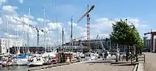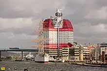 Lilla Bommen is a part of the Gothenburg harbor on the shore of the Göta älv. Said to have been constructed in the 1640s, as of 2015 it is used as a marina, owned and operated by the Gothenburg Municipality through the Liseberg company, for visiting pleasure craft.[7] Lilla Bommen is also the name of the land surrounding the harbor.[8] On the west side of the dock is The Göteborg Opera house, completed in 1994 while on the east is an office complex that includes a high-rise with the same name as the area, the Lilla Bommen.[9] The building is locally known as "The Lipstick" or "The Skanska Skyscraper". The barque Viking is moored between the dock and the high-rise.[10]