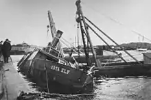 On 15 April 1908, the steamboat Göta Elf,[16] capsized and sank in the Lilla Bommen harbor. The steamer was fully loaded with cargo and passengers, twentysix people died and the accident was widely publicized in national press.[17] The somewhat gruesome salvage operation was filmed by photographer Charles Magnusson and was shown, uncensored, as part of one of Sweden's first newsreels.[18] The boat was built in 1884 at Thorskogs wharf and operated the route Gothenburg–Lilla Edet–Trollhättan.[19]