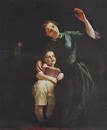 The Spencers experienced chronic financial difficulties. In pursuit of greater opportunity they moved to New York City in 1848. There she was already known through exhibitions at the National Academy of Design and the American Art-Union. By the time the Spencers arrived in New York "art patronage was firmly in the hands of the middle class which was eager to ‘purchase’ culture, and quick to assert their preference for scenes which they could identify."[5] Lilly Martin Spencer easily filled this gap with domestic scenes, often using her own family and pets as models. In 1849 she produced her first major successful painting, Life's Happy Hour. Scholars have noted that due to the demand of the time Spencer was "able to combine her two roles, as artist and mother with a certain degree of success."[5] Her works were all positive and devoid of tragedy, depicting endearing scenes of domesticity; academics have commented that in this period "her paintings exude an enthusiasm and happiness reminiscent of seventeenth-century Dutch art…(and are) enhanced by a disarming gaze directly toward the viewer or his inclusion in a coy flirtation, tease, or practical joke."[5]