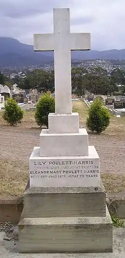 The Ladies' Grammar School and Kindergarten moved to Albuera Street, Battery Point, in 1898 and was run by Nellie Poulett-Harris until her retirement in December 1919,[47] whilst Lily's twin, Violet, went on to become a relatively well-known actress on the Australian theatre circuit, under the stage name Mary Milward.[48][49] She moved to Melbourne for a time and was trained in Shakespearian performance but eventually settled on light comedies as her area of interest.[50][51][52] She spent her remaining days teaching music and elocution.[53][54] "Vi[olet] always helped Nell in her schools though one pupil's memory was of her often tippling on the sly and her... nephew... thought her distinctly dotty as she grew older!"[43] By 1931, she was working as a governess for four young children.[55] She died on 26 December 1941, at the Albuera Street address[56] whilst Nellie died in the New Norfolk Asylum in July 1935 from arteriosclerosis.[57]