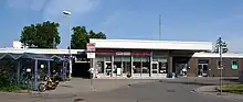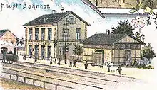 The original entrance building on the east side of the railway station is a neoclassical structure with plaster work and was built in 1854. In addition, there was a toilet block and a wooden goods shed, which was demolished in 1992.[5] After the Second World War a new entrance building was opened on the other side of the line.