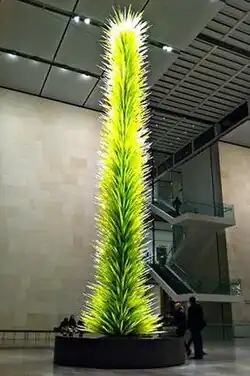 Working with his team of glassblowers, Chihuly designed Lime Green Icicle Tower specifically for the Shapiro courtyard.[3][2] The artwork, which measures 42.5 feet (13.0 m) high and 7 feet (2.1 m) wide, features 2,342 pieces of blown glass and weighs approximately 10,000 pounds (4,500 kg).[4][5] Andrea Shea of WBUR-FM described the color of the sculpture as Kermit the Frog.[6] Journalist John O'Rourke of Boston University described Lime Green Icicle Tower as an "exotic, neon-hued palm tree that has taken root in a giant greenhouse" while Judith H. Dobrzynski of The Wall Street Journal described it as a "cross between a cactus and a poplar tree."[1] [7] Although Sebastian Smee, Pulitzer Prize-winning art critic for The Boston Globe, is not a fan of Chihuly's work in general, he praised the sculpture. Smee stated: "I defy anyone not to like it" and the sculpture is "so good it's hard to imagine that Malcolm Rogers, the MFA's director, will not find a way to keep it there long term."[8][9]