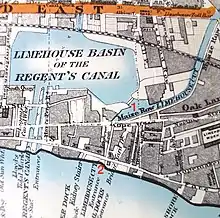 John Cary's New and Accurate Plan of London of 1795 shows that, by that date, a portion of the canal, near its outlet at Limehouse, had been expanded to form a large basin, with an island in the middle marked "Timber Yd", accessible by a causeway.[75] This was the first basin in Limehouse, built 25 years before the better known Regent's Canal dock which now bears that name.