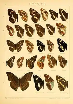 L. helmanni Led. (57b) has the ground-colour blackish brown, the pattern being similar to that of the preceding species [Limenitis camilla; the cell of the forewing, however, bears a whitish basal streak followed distally by a white acutely triangular spot; the while spots of the central area are small and isolated, and the band of the hindwing, which is directed towards the centre of the hindmargin, is composed of separated spots. On the hindwing above there are sometimes small, whitish, elongate, submarginal spots. Central Asia: Altai, eastern districts of Amurland; West and Central China; Corea. — pryeri Moore is on an average larger, the white markings are widened, both wings have distinct while sumarginal spots, the underside is more strongly marked with more prominent white spots on the hindwing. North-East China (Ning-po), Ussuri, Amurland, Corea, Japan. — In duplicata Stgr. male 61d, 57b underside of female, erroneously named doerriesi U. on plate) the increase in the size of the white markings reaches its maximum; the band of the hindwing is continuous and of double or threefold width. Amurland).[2]