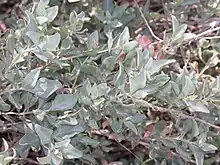 It can grow up to 90–120 cm (35–47 in) tall,[5][6][7] with much branched,[6][7] and leafy stems.[5][8] They are terete (round in cross-section) and grey in colour.[5] The leaves are normally at the top of the branches, leaving the base of the branch, bare with leaf scars.[9]