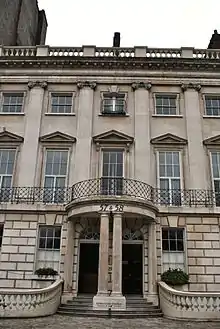 When originally laid out, Lincoln's Inn Fields was part of fashionable London. The completion of the houses that surrounded it proceeded at a leisurely pace, interrupted by the English Civil War. In 1659 James Cooper, Robert Henley, and Francis Finch and other owners of "certain parcels of ground in the fields, commonly called Lincoln's Inn Fields", were exempted from all forfeitures and penalties which they might incur in regard to any new buildings they might erect on three sides of the same fields, previously to 1 October in that year, provided that they paid for the public service one year's full value for every such house within one month of its erection; and provided that they should convey the "residue of the said fields" to the Society of Lincoln's Inn, for laying the same into walks for common use and benefit, whereby the annoyances which formerly have been in the same fields will be taken away, and passengers there for the future better secured."[8] The oldest building from this early period is Lindsey House, 59–60 Lincoln's Inn Fields, which was built in 1640 and has been attributed to Inigo Jones.[9] The builder may have been David Cunningham, 1st Baronet of Auchinhervie, a friend of the mason-sculptor Nicholas Stone, who also supervised the rebuilding of Berkhamsted Place for Charles I.[10] It derives its name from a period of ownership in the 18th century by the earls of Lindsey.[11]