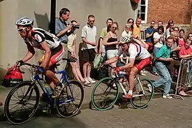 Velo Club Lincoln changed the name of the Witham-Valley Grand Prix to the Lincoln Grand Prix in 1968.[17] Doug Dailey went onto win the first race named Lincoln GP, catching Les West on the run up to the finish, with Graham Owen in 3rd place in a small group ahead of the main pack.[21] Star Trophy ranking had now awarded to the Lincoln GP. For the next 3 years well-known riders dominated the race. In 1969, Clifton CC's all rounder, Pete Smith won by a margin of 1min 51sec.[22] Tom Mullins won the next round of racing in 1970 from a big bunch finish.[23] In both 1969 and 1970, Beeston RC's Ian Hallam finished 3rd on the podium. In 1971, track pursuit rider Dave Allen from Birkenhead North End CC finished first.[24] At the 1972 edition there was a 2-way fight between Britain's leading road racers, Phill Edwards and Phill Bayton. Brayton made a big attack with just 2 miles to go, which Edwards successfully countered and beat his opponent by 3 bike lengths on the finishing line.[25] On a wet day in 1973 Dave Vose beat Peter Watson from Clifton CC and his own team mate John Clewarth to take the win for Kirby CC.[26] Archer RC's, Steve Heffernan went on to win the Grand Prix of 1974 where Beeston RC's Ian Hallam came 3rd again.[27] 1975 marked the 20th edition of the Lincoln GP in which Tony Gornall of Clayton Velo out-sprinted the main bunch leading home a select group of just 17 riders.[28] 1976 produced one of the best races yet. The race finished with a sprint between 2 riders after what had been a very fast race with an average above 26mph. Bill Nixon beat Joe Waugh and was 2min 33sec up of future race winner, Steve Lawrence.[29]