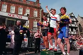 The 1977 edition was just as good a race with a breakaway group formed early in containing all the race favourites; however, it had a slightly chaotic finish. A junior race that was happening at the same time as the main Lincoln GP had just received their bell for the last lap, at which point, the race leaders came through the finish line approximately 30 seconds later. It was apparent to the organisers that the leaders of the men's race and remains of the break away would catch the juniors, so after a re-think the organisers added a 1 mile extension, leaving some of the seniors, including Dave Cumming, confused and temporarily losing contact with the race.[30] Dave Cumming managed to out sprint Steve Lawrence and the remaining group to take the win.[31] Ian Hallam placed 3rd yet again.[31] At this point Steve Lawrence, who was riding for VC Olympia Sport at the time, had finished in both places other than first, on the podium.[32] In 1978 he finally took the win, after working hard to chase down Scottish rider Robert Miller was 30 seconds ahead entering the last lap. Miller dropped to 5th by the time the line came around again, after being caught by Lawrence and a number of other riders.[33]
