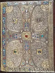 The Lindau Gospels is an illuminated manuscript in the Morgan Library in New York, which is important for its illuminated text, but still more so for its treasure binding, or metalwork covers, which are of different periods. The oldest element of the book is what is now the back cover, which was probably produced in the later 8th century in modern Austria, but in the context of missionary settlements from Britain or Ireland, as the style is that of the Insular art of the British Isles. The upper cover is late Carolingian work of about 880, and the text of the gospel book itself was written and decorated at the Abbey of Saint Gall around the same time, or slightly later.[1]