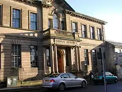 The Lindsay Institute is named after its Lanark-born benefactor Charles Lindsay of Ridge Park, Lanark. He gifted the money to the town but it took 30 years before his vision of a library, reading room and museum was realised. He was a man who was keen to provide support for projects which would benefit the people of his home town. The Lindsay Institute was opened on 25 June 1914 by Sheriff Scott Moncrieff. The architects were John Traill and John Stewart of Traill and Stewart.[1] The library is situated on the corner of Hope Street and North Vennel. The building is a classical design and is built of Ashlar stone which came from Denwick Quarry in Northumberland.[2] The toilet in the library retains all its original features except the toilet seat which has been replaced.[3] The building now houses Lanark Library, which is run by South Lanarkshire Leisure and Culture.[4]