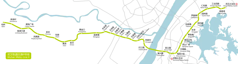 The Line 4 of Wuhan Metro (Chinese: 武汉地铁4号线) is the third line in Wuhan Metro system, and it will be the second metro line crossing the Yangtze river in Wuhan. It is colored grass-green, which is the identifying color of this line, which would appear on its trains, station signs, and the official subway map.