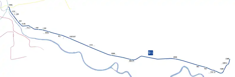 Line 9 is a rapid transit line of the Tianjin Metro. It spans 52.8 km (32.8 mi) with 21 stations, connecting the urban area of Tianjin with Binhai New Area, a new area within the jurisdiction of Tianjin Municipality. The one-way journey time is approximately one hour.