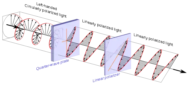 Circular polarizer creating left-handed circularly polarized light. It is considered left-handed as viewed from the receiver and right-handed as viewed from the source.[11]