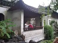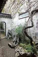 A winding roofed corridor which connects the entry hall, residence, and Old Intertwined Trees Court. It is marked by a tablet inscribed by Suzhou Magistrate Wu Yun reading, "Lingering garden".[2] |