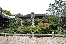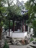 This five bay full gable structure was inspired by a verse from Li Bai, "There are five peaks to the south of Mount Lu which seem to be the golden lotus flowers cut out by nature". The selection of this verse was in turn was inspired by the preexisting Ming Dynasty grotto which faces the front of the hall.[2] On the backside of the Hall a courtyard houses one of the 12 famous scholar stones, Rhesus Monkey Peak, of Liu Su's collection. Inside are numerous pillar couplets. |