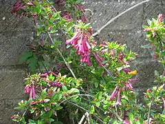 Growing to 4 m (13 ft) tall and broad, it is a semi-evergreen or evergreen shrub with shiny ovate leaves and clusters of tubular cerise flowers to 5 cm (2.0 in) long. The flowers bloom year-round (in the wild) except in the spring. It fruits (produces a seed pod) year-round (in the wild) except May and June.