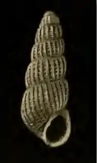 The small, slender shell measures 2.6 mm. It is turreted, milk-white. The nuclear whorls are small, strongly obliquely immersed in the first post-nuclear whorl, only a portion of the last solution is visible. The seven post-nuclear whorlsare strongly shouldered, moderately rounded, rather high between the sutures, and appearing somewhat constricted at this point. They are marked by strong, rounded, backward slanting axial ribs, which render the summits of the whorls strongly crenulate. Fourteen of these ribs occur upon the second, twenty-three upon the fourth, and thirty-two upon the penultimate whorl. The intercostal spaces are about twice as wide as the ribs, crossed between the sutures by five subequally spaced, raised spiral threads, the posterior one of which is a little farther from the summit than it is from its adjacent fellow; it is also a little less strongly developed than the rest. The ribs and spiral threads thus form a series of meshes or reticulations. The periphery and base of the body whorl are well rounded, sculptured, like the spaces between the sutures, by the axial ribs which continue prominently to the narrow umbilicus, and six subequal and subequally spaced spiral threads, with an indication of a very weak seventh within the narrow umbilicus. The ovoid aperture is moderately large. The posterior angle is obtuse. The outer lip is strong. The columella is slender, decidedly curved, and somewhat revolute, with a prominent oblique fold near its insertion The parietal wall is covered by a very strong callus, which gives the periostracum a complete appearance.[2]
