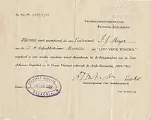 The Lint voor Wonden / Lint voor Verwonding, officially designated Lint voor Verwonding Opgedaan Gedurende de Anglo-Boere Oorlog, 1899–1902 (Riband for Wounds Sustained During the Anglo-Boer War, 1899–1902) and referred to as the Lint voor Wonden in some subsequent official documents, was instituted in terms of Government Notice no. 2307 dated 21 December 1920 and published in the Union of South Africa Government Gazette of 24 December 1920. It was a retrospective award for Boer veteran officers and men who were wounded in action while serving in the combat forces of the South African Republic and the Orange Free State during the Second Boer War between 11 October 1899 and 31 May 1902.[1][4]