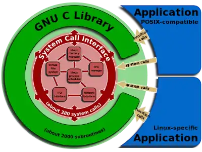 The Linux API includes the kerneluser space API, which allows code in user space to access system resources and services of the Linux kernel.[3] It is composed of the system call interface of the Linux kernel and the subroutines in the C standard library. The focus of the development of the Linux API has been to provide the usable features of the specifications defined in POSIX in a way which is reasonably compatible, robust and performant, and to provide additional useful features not defined in POSIX, just as the kerneluser space APIs of other systems implementing the POSIX API also provide additional features not defined in POSIX.