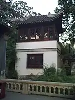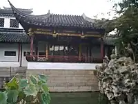 Built during the 1917 renovation as an entry into the courtyard of the Nine Lion Peak rockery. It is a three bay hall with a portico on the north facade and a square pavilion attached to the south facade. |