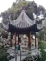 Named for the adjacent grove of prunus mume trees, this pavilion has a tablet with the inscription, "The latticed window frames the spring scene outside". |