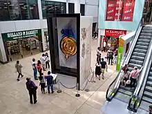 For many years a central feature of the atrium was a white pillar with the statue of a large red lion on the top of it, safely out of easy reach. This recalled the Red Lion pub which had occupied the site until demolished in 1969.[3] The lion statue was removed in 1999 and is now at the Cambridge University rugby club's ground on Grange Road.[4] A red lion is an emblem of the University of Cambridge and the crest of its rugby club.