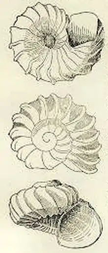 Original drawing with three views of a shell of Liotella polypleura