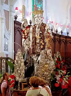 In the course of the eighteenth century frescos with biblical scenes were painted on the vaults. In 1728, the silver statue of the patron Bartholomew was created, as well as the wooden altar to the left of the apse, in thanksgiving for his protection during the 1693 Sicily earthquake, in which Lipari was unscathed.[1] Between 1755 and the end of the century, work was begun on the campanile. In 1772 the cathedral was expanded with two side naves. The right side nave incorporated the north ambulatory of the cloisters. Work also began on the facade of pale Vesuvian stone in 1772, intended to give a delicate contrast and sense of dynamic harmony with the interior of the duomo. In the last decades of the eighteenth century, marble altars decorated with paintings by Antonio Mercurio were added. In 1859 the cathedral was struck by lightning, destroying the gable of the facade and the causing some vaults to collapse. Repair work began immediately and was completed in 1861. The lost ceiling paintings have never been restored.
