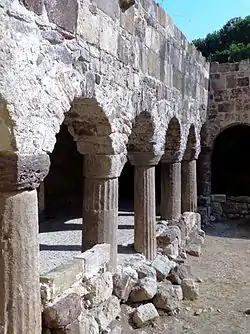 Initially the cloisters were square, but the north side was shorted. In the centre, a garden was rimmed by a colonnaded gallery. The north side was incorporated into the church during the 1516 restorations, becoming the right nave. The columns are all fluted and are particularly valuable since they were spoliated from earlier Roman houses. Similar columns have been found submerged in the port. Some of the column capitals depict monstrous animals or doves eating dates. They were probably made by an artisan imitating the Clunian style. Fragments of the ancient pavement are stored in the local Museo archeologico regionale eoliano, along with other material recovered during excavations, and a photographic reproduction of the "Constitutum" of Abbot Ambrogio in the Norman period.