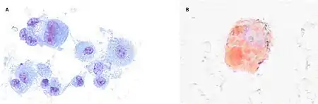 Lipid-laden alveolar macrophages, also known as pulmonary foam cells,[2] are cells found in bronchoalveolar lavage (BAL) specimens that consist of macrophages containing deposits of lipids (fats).[3] The lipid content of the macrophages can be demonstrated using a lipid targeting stain like Oil Red O or Nile red.[2][4][5][6] Increased levels of lipid-laden alveolar macrophages are associated with various respiratory conditions, including chronic smoking,[3] gastroesophageal reflux, lipoid pneumonia, fat embolism,[7] pulmonary alveolar proteinosis[3][8] and pulmonary aspiration.[2][9] Lipid-laden alveolar macrophages have been reported in cases of vaping-associated pulmonary injury.[10][1][11]