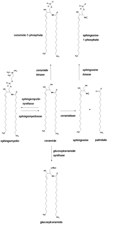 Ceramide (Cer) can be generated by the breakdown of sphingomyelin (SM) by sphingomyelinases (SMases), which are enzymes that hydrolyze the phosphocholine group from the sphingosine backbone. Alternatively, this sphingosine-derived lipid (sphingolipid) can be synthesized from scratch (de novo) by the enzymes serine palmitoyl transferase (SPT) and ceramide synthase in organelles such as the endoplasmic reticulum (ER) and possibly, in the mitochondria-associated membranes (MAMs) and the perinuclear membranes. Being located in the metabolic hub, ceramide leads to the formation of other sphingolipids, with the C1 hydroxyl (-OH) group as the major site of modification. A sugar can be attached to ceramide (glycosylation) through the action of the enzymes, glucosyl or galactosyl ceramide synthases.[1] Ceramide can also be broken down by enzymes called ceramidases, leading to the formation of sphingosine,[2][3] Moreover, a phosphate group can be attached to ceramide (phosphorylation) by the enzyme, ceramide kinase.[4] It is also possible to regenerate sphingomyelin from ceramide by accepting a phosphocholine headgroup from phosphatidylcholine (PC) by the action of an enzyme called sphingomyelin synthase.[5] The latter process results in the formation of diacylglycerol (DAG) from PC.