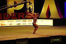 ![]() Lisa Aukland doing a double bicep pose on September 26, 2008, during the 2008 Ms. Olympia finals. | |