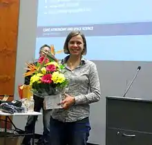 Lisa Harvey-Smith (born 1979) is a British-Australian astrophysicist, Australia's Women in STEM Ambassador and a Professor of Practice in Science Communication at the University of NSW. Her research interests include the origin and evolution of cosmic magnetism, supernova remnants, the interstellar medium, massive star formation and astrophysical masers.[3] For almost a decade Harvey-Smith was a research scientist at Australia’s Commonwealth Scientific and Industrial Research Organisation (CSIRO), including several years as the Project Scientist for the Square Kilometre Array Pathfinder and later Project Scientist for the Australian Square Kilometre Array Pathfinder (ASKAP) Telescope.[4]