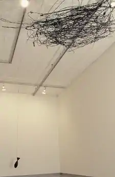 Hoke gained early recognition for acrobatic, unwelded wire and metal suspensions of cast objects that explored balance, gravity, aerodynamics and the activation of voids in space.[29][8][18] Critic Lucy Lippard wrote that these pieces sketched barely visible energy patterns and posed weighty questions about physical reality using minimal means (e.g., Magnet, 1989),[22] a quality she likened to Eva Hesse works that "endow[ed] formal austerity with subtle emotional resonance."[30][31] The sculptures Eclipse and Levee (both 1987) cradled fruit forms made from green sand castings in small wire slings held mid-air in taut, uncertain balance by stretched cables and simple steel forms; for Equilibrium (1990), Hoke created a ceiling-bound, tangled cloud of wire that was hoisted by a hand-shaped counterweight across the room.[32][33][29] Reviews in Arts and Art International related the gestural effect and graphic presence of such work to the concept of drawing in space associated with modernist sculptors Julio González and David Smith, among others.[34][29]