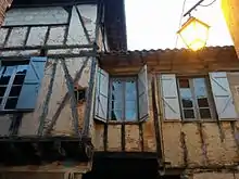 The town's grid-like layout includes straight, uniform streets lined with half-timbered, red-brick houses. The town is made up of four districts, each of which is enclosed by a fortified gate. The market square is the largest of all the south-western bastides, with about 5,000 m2. It was renovated in 2000. The town has a museum on the main square to the artist Raymond Lafage.