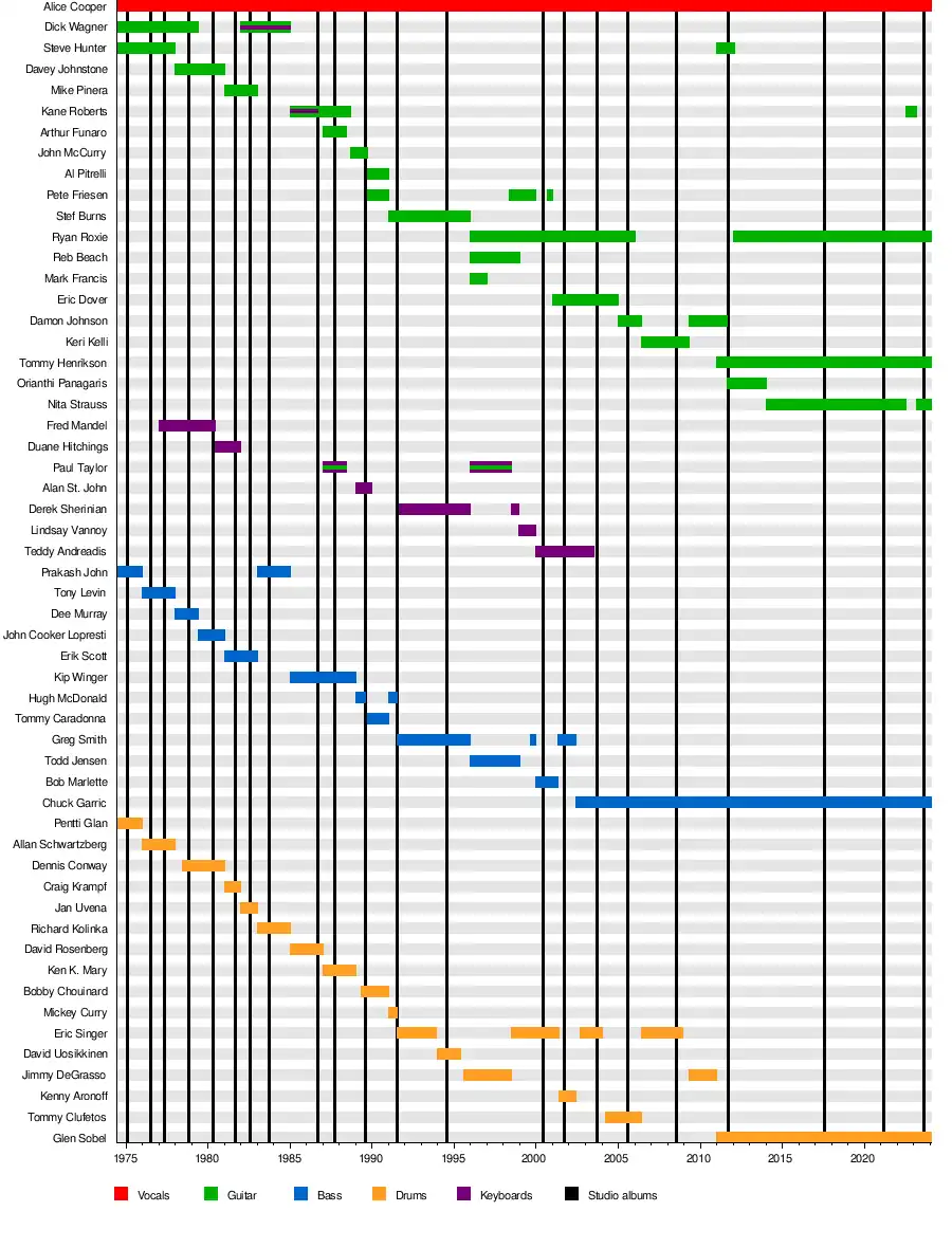 This list is about the members of the post-1973 era Alice Cooper solo act and not the original Alice Cooper Band.