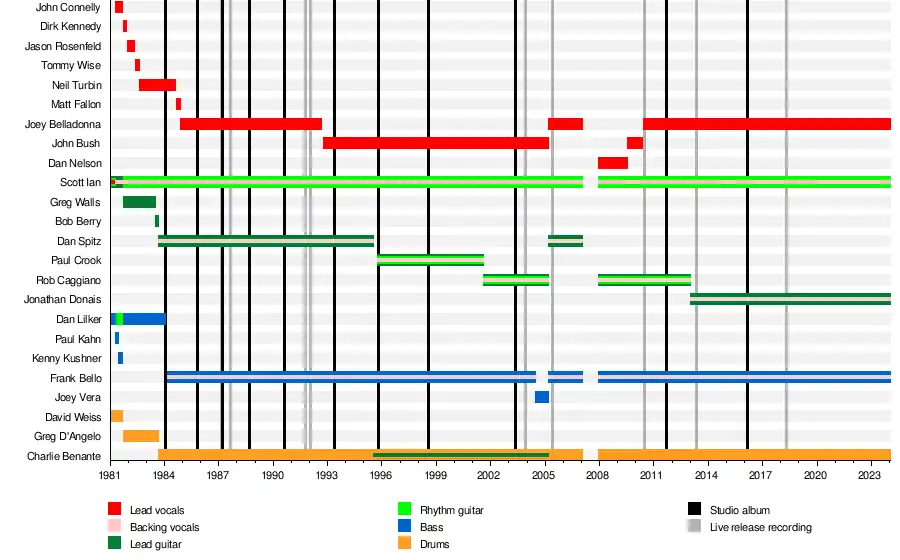 Anthrax is an American thrash metal band from New York City. Formed in 1981, the group was originally a foursome consisting of guitarist Scott Ian, bassist Dan Lilker and drummer Dave Weiss. The band has been through many personnel changes, and currently includes rhythm guitarist Scott Ian, drummer Charlie Benante (since 1983), bassist Frank Bello (since 1984), vocalist Joey Belladonna (from 1984–1992, 2005–2007 and since 2010) and lead guitarist Jonathan Donais (since 2013).