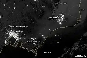 NASA image showing the Snowy River bushfire in Eastern Victoria at night in February 2014. The bushfire which lasted for 70 days grew to 165 800 ha and was roughly the same size as Melbourne. Also visible are the fires at the Hazelwood coalmine and Kilmore. Source: NASA Earth Observatory.