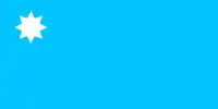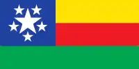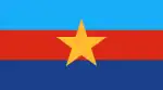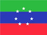Flag of the Kokang Self-Administered Zone Blue-red-green horizontal triband charged with a white star and 8 white circular rings forming an arc above the star.