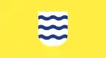 1974–2010 Former flag of Ayeyarwady Division A stylized orange map of Ayeyarwady Region in a white box on top a field of white and blue waves with the text ဧရာဝတီတိုင်း ("Ayeyarwady Division") above the map