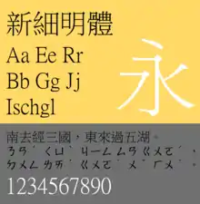 PMingLiU 新細明體 TC (Taiwan) Microsoft Windows 95+ Distributed with Traditional Chinese version of Windows 95, all regional versions of Windows 2000 to Windows 8.1, and the Traditional Chinese version of Windows 10. The Latin characters in this font is proportional.