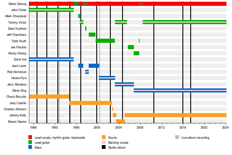 Danzig evolved from Samhain and originally included eponymous vocalist and keyboardist Glenn Danzig (real name Glenn Anzalone), guitarist John Christ (real name John Knoll), bassist Eerie Von (real name Eric Stellmann) and drummer Chuck Biscuits (real name Charles Montgomery).[1] After recording four studio albums, Biscuits left Danzig in the summer of 1994 following a contractual dispute with the frontman.[2] He was replaced by former Sugartooth drummer Joey Castillo, after Dave Grohl turned down an offer to join.[3] Christ and Von also left the following year, announcing their departure from the band in July 1995 due to a "breakdown in communication",[4] said to stem from "the monopoly Glenn Danzig [had] on songwriting".[5]