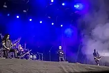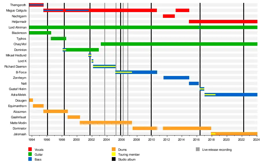 During a tour in early 1998, Dominion (Matti Mäkelä) joined as a touring bassist; in the summer, Typhos left and Dominion switched to guitar, with Emperor Magus Caligula taking over bass duties again.[2] Before a tour in the fall, Alzazmon was replaced by Gaahnfaust (Robert Lundin).[2] After recording the EP Teach Children to Worship Satan, Gaahnfaust was replaced by Matte Modin in the summer of 2000, who debuted on the recording of Diabolis Interium early the next year.[2] The subsequent touring cycle featured a string of touring bassists – first Mikael Hedlund, then Kenth "Lord K" Philipson, and finally Richard "Daemon" Cabeza.[2][5] By the end of the year, Dominion had left the group due to a "lack of motivation", with Chaq Mol (Bo Anders Nymark) taking over early the next year.[2]