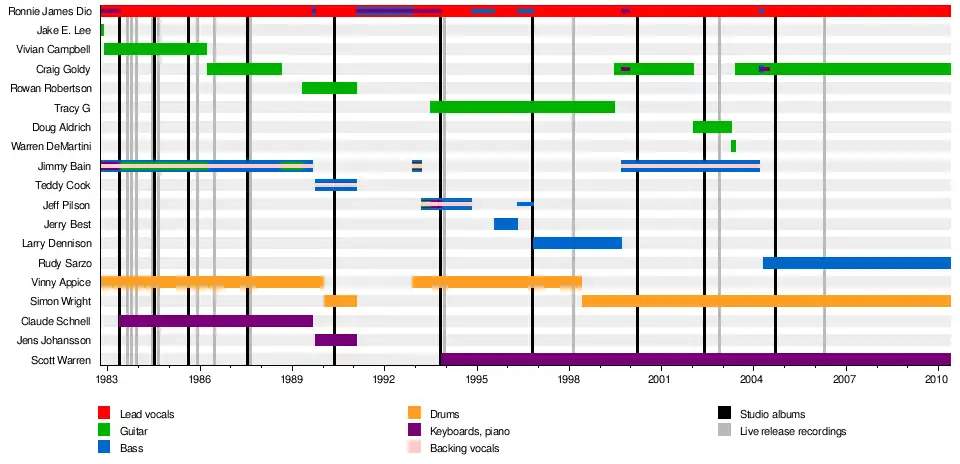 Appice was replaced, again, by Simon Wright.[20] The following year, former members Goldy and Bain also returned.[21][22] Again, Goldy only lasted one album – 2000's Magica – before he was replaced by Doug Aldrich in January 2002.[23] The new guitarist recorded Killing the Dragon, but by early 2003 had left due to "scheduling conflicts" with his other group Whitesnake.[24] Aldrich was originally set to be replaced by Ratt guitarist Warren DeMartini,[25] however he was replaced within a month by the returning Goldy.[26] Bain also left in early 2004.[27] Pilson returned to perform on Master of the Moon, with former Ozzy Osbourne bassist Rudy Sarzo taking over on tour from July.[28] Aldrich would later return to fill in for Goldy on tour in 2005 due to an arm injury,[29] and again in 2009 due to scheduling conflicts with Budgie.[30]